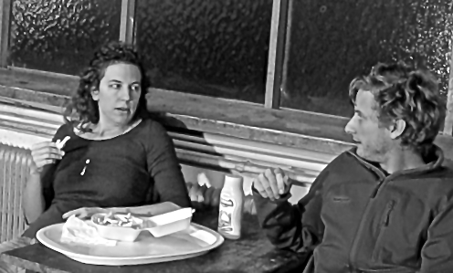 Und? Schmeckt’s wenigstens? – Nein. Ja, da darfst du dich nicht wundern. Das kommt alles aus dem Gefrierfach. Überall gäb’s frische Erdäpfel und du nimmst dir – Du hast dich grad angepatzt. Da und da. Da kannst jetzt nix mehr machen. Das ist Fett. Das bleibt.